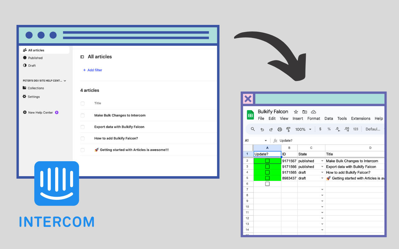 Bulk actions for Intercom via Google Sheets. Download a CSV of articles and make changes to the title, description, and publication status in bulk.
